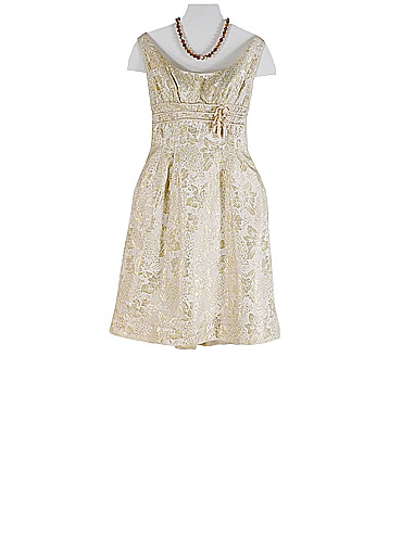 Meitenīga vakarkleita no brokāta auduma ar ieaustu narcišu rakstu. Rotāta ar trīs atlasa lentes pušķīšiem.