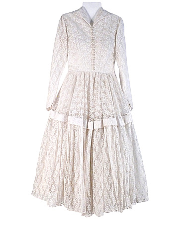 Tipiska 50. gadu kāzu kleita. Ļoti kupla svārku daļa ar iestrādātiem, cietināta lina apakšsvārkiem, un ļoti šaura augšdaļa ar pērļu podziņu rindu. Materiāls- sintētiskās mežģīnes.